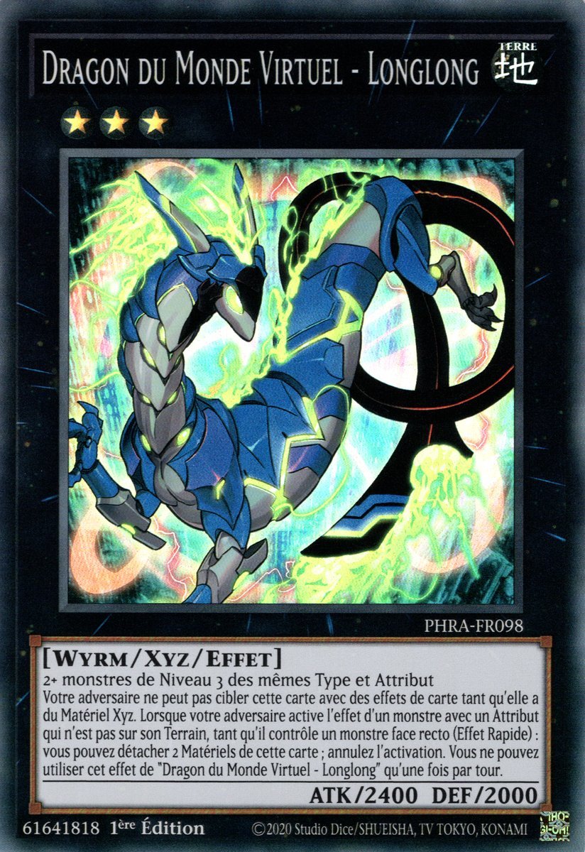 2+ monstres de Niveau 3 des mêmes Type et Attribut Votre adversaire ne peut pas cibler cette carte avec des effets de carte tant qu'elle a du Matériel Xyz. Lorsque votre adversaire active l'effet d'un monstre avec un Attribut qui n'est pas sur son Terrain, tant qu'il contrôle un monstre face recto (Effet Rapide) : vous pouvez détacher 2 Matériels de cette carte ; annulez l'activation. Vous ne pouvez utiliser cet effet de "Dragon du Monde Virtuel - Longlong" qu'une fois par tour.