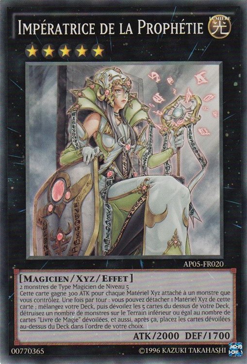 Cette carte gagne 300 ATK pour chaque Matériel Xyz attaché à un monstre que vous contrôlez. Une fois par tour : vous pouvez détacher 1 Matériel Xyz de cette carte ; mélangez votre Deck, puis révélez les 5 cartes du dessus de votre Deck et détruisez un nombre de monstres sur le Terrain inférieur ou égal au nombre de cartes "Livre de Magie" révélées, puis renvoyez les cartes révélées au-dessus du Deck dans l'ordre de votre choix.