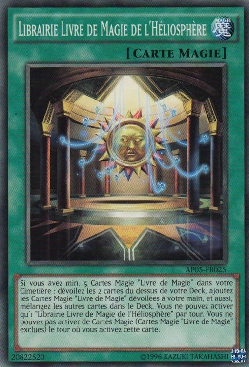 Si vous avez 4 ou plus cartes Livre de Magie dans votre Cimetière: révèlez les 2 cartes du dessus de votre Deck, ajoutez les cartes révélées Livre de Magie à votre main, mélangez les cartes restantes dans le Deck. Vous ne pouvez activer 1 Bibliothèque de livres de magie d'Heliosphere par tour. Vous ne pouvez pas activer les Cartes Magie le tour où vous activez cette carte, sauf Cartes Livre de Magie.