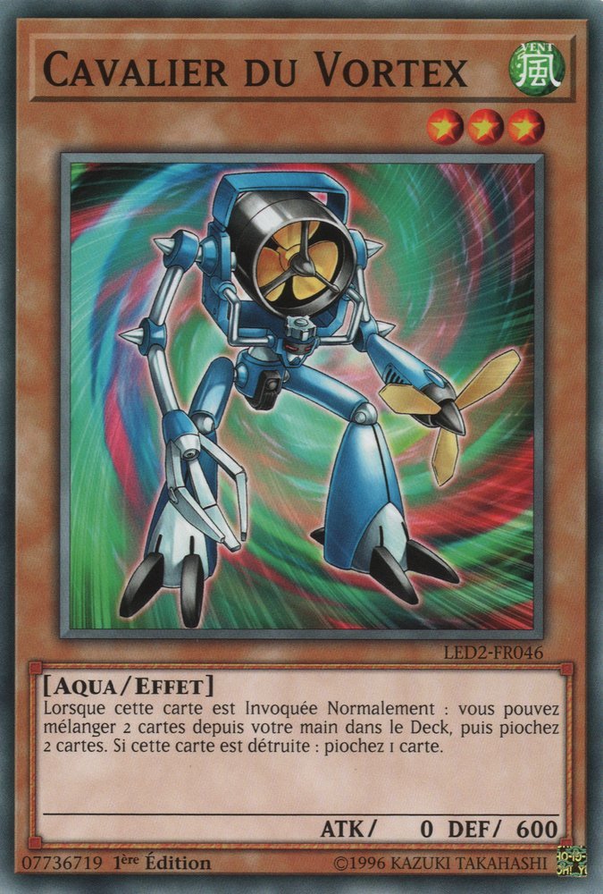 Lorsque cette carte est Invoquée Normalement : vous pouvez mélanger 2 cartes depuis votre main dans le Deck, puis piochez 2 cartes. Lorsque cette carte est détruite : piochez 1 carte.