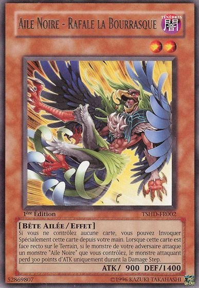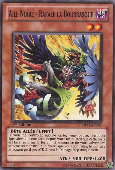 Si vous ne contrôlez aucune carte, vous pouvez Invoquer Spécialement cette carte depuis votre main. Lorsque cette carte est face recto sur le Terrain, si le monstre de votre adversaire attaque un monstre "Aile Noire" que vous contrôlez, le monstre attaquant perd 300 points d'ATK uniquement durant la Damage Step.
