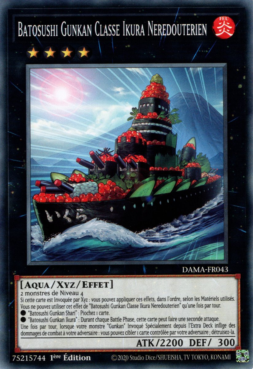 2 Level 4 monsters If this card is Xyz Summoned: You can apply these effects, in sequence, based on the materials used. You can only use this effect of "Gunkan Suship Ikura-class Dreadnought" once per turn. • "Gunkan Suship Shari": Draw 1 card. • "Gunkan Suship Ikura": This card can make a second attack during each Battle Phase. Once per turn, when your "Gunkan" monster Special Summoned from the Extra Deck inflicts battle damage to your opponent: You can target 1 card your opponent controls; destroy it.
