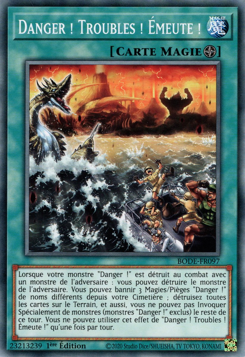 When your "Danger!" monster is destroyed by battle with an opponent's monster: You can destroy that opponent's monster. You can banish 3 "Danger!" Spells/Traps with different names from your GY; destroy all cards on the field, also you cannot Special Summon monsters for the rest of this turn, except "Danger!" monsters. You can only use this effect of "Danger! Disturbance! Disorder!" once per turn.