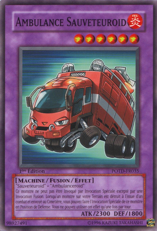 "Rescueroid" + "Ambulanceroid" This monster cannot be Special Summoned except by Fusion Summon. Once per turn, when a monster on your side of the field is destroyed by battle and sent to the Graveyard, you can Special Summon that monster in Defense Position.