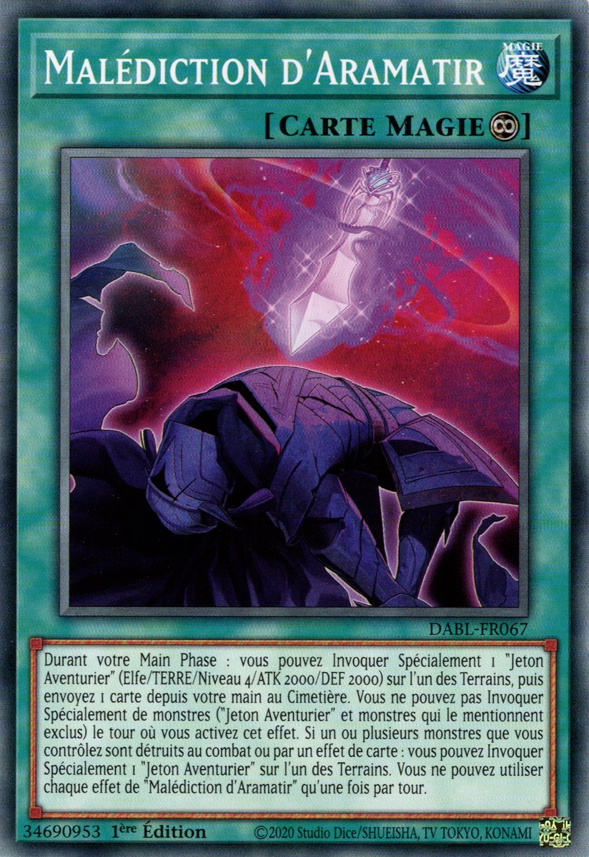 During your Main Phase: You can Special Summon 1 "Adventurer Token" (Fairy/EARTH/Level 4/ATK 2000/DEF 2000) to either field, then send 1 card from your hand to the GY. You cannot Special Summon monsters the turn you activate this effect, except "Adventurer Tokens" and monsters that mention it. If a monster(s) you control is destroyed by battle or card effect: You can Special Summon 1 "Adventurer Token" to either field. You can only use each effect of "Curse of Aramatir" once per turn.