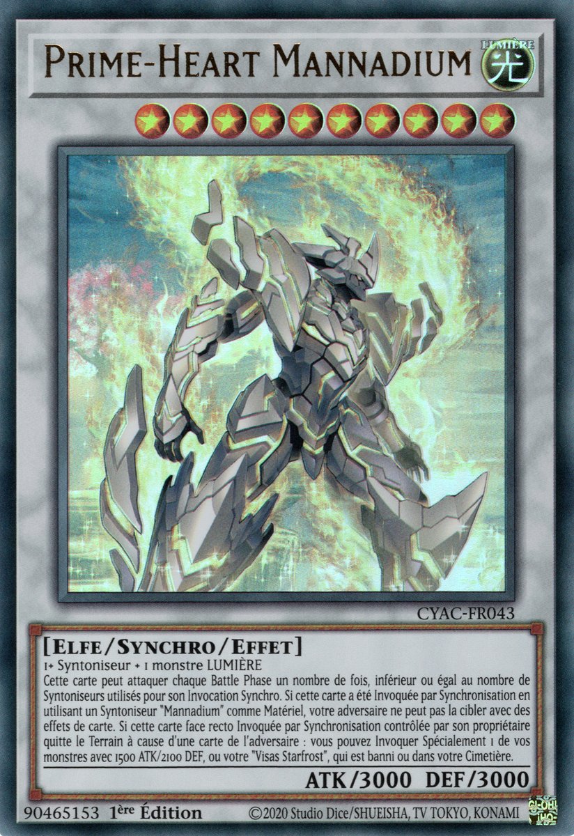 1+ Tuners + 1 LIGHT monster This card can attack a number of times each Battle Phase, up to the number of Tuners used for its Synchro Summon. If this card was Synchro Summoned using a "Mannadium" Tuner as material, your opponent cannot target it with card effects. If this face-up Synchro Summoned card in its owner's control leaves the field because of an opponent's card: You can Special Summon 1 of your monsters with 1500 ATK/2100 DEF, or your "Visas Starfrost", that is banished or in your GY.