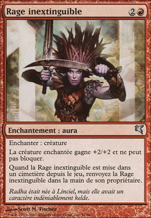 Enchant creature Enchanted creature gets +2/+2 and can't block. When Undying Rage is put into a graveyard from the battlefield, return Undying Rage to its owner's hand.