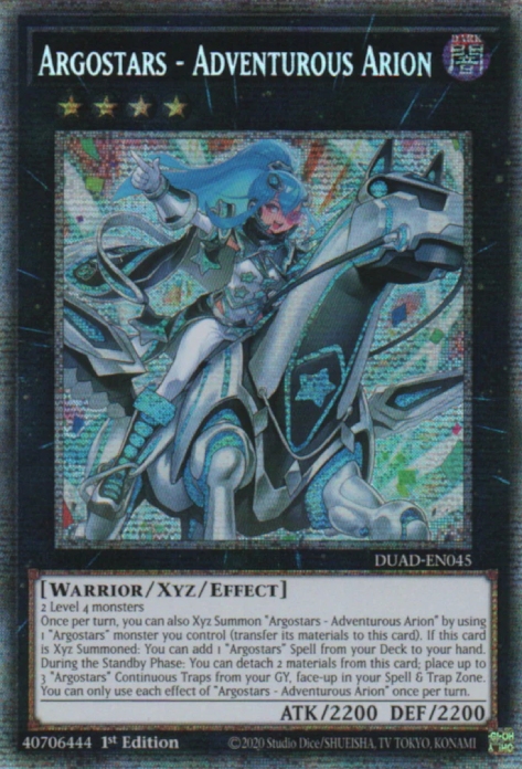 2 Level 4 monsters Once per turn, you can also Xyz Summon "Argostars - Adventurous Arion" by using 1 "Argostars" monster you control (transfer its materials to this card). If this card is Xyz Summoned: You can add 1 "Argostars" Spell from your Deck to your hand. During the Standby Phase: You can detach 2 materials from this card; place up to 3 "Argostars" Continuous Traps from your GY, face-up in your Spell & Trap Zone. You can only use each effect of "Argostars - Adventurous Arion" once per turn.
