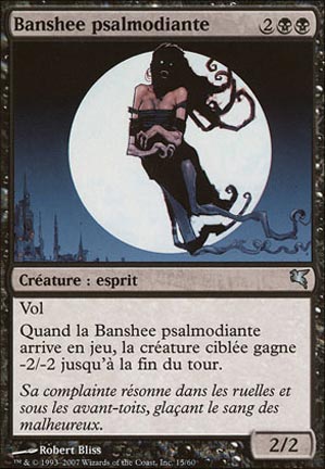 Flying (This creature can't be blocked except by creatures with flying.) When Keening Banshee comes into play, target creature gets -2/-2 until end of turn.