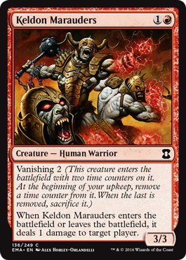 Vanishing 2 (This creature enters the battlefield with two time counters on it. At the beginning of your upkeep, remove a time counter from it. When the last is removed, sacrifice it.) When Keldon Marauders enters or leaves the battlefield, it deals 1 damage to target player or planeswalker.