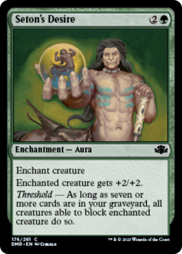 Enchant creature Enchanted creature gets +2/+2. Threshold — As long as seven or more cards are in your graveyard, all creatures able to block enchanted creature do so.