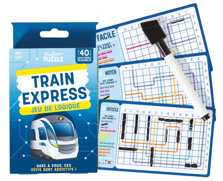 Train Express contains 40 challenge cards with increasing and evolving difficulty. The cards are erasable, allowing you to reuse them as often as you like. Perfect for entertaining all ages, whether at home or on the go!