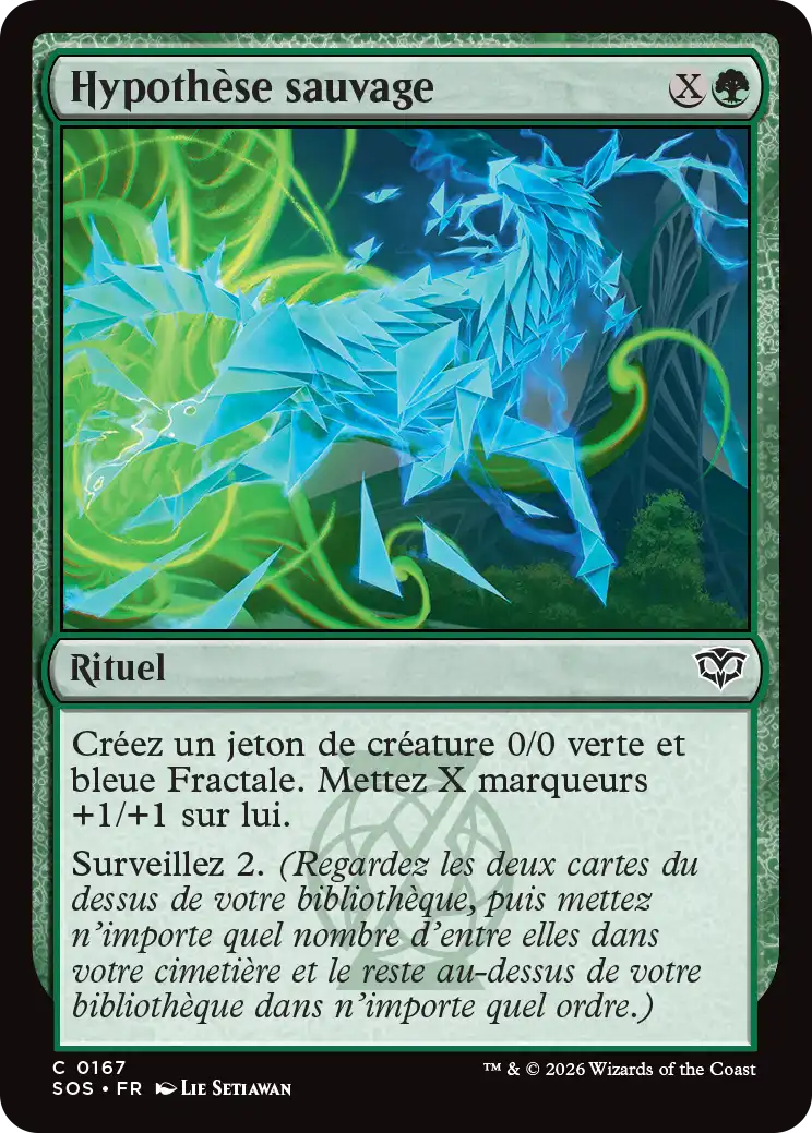 Hypothèse sauvage crée un jeton de créature 0/0 avec autant de marqueurs +1/+1 sur lui que de manas dépensés pour payer X dans son coût. Il s'adapte au nombre de manas dont vous disposez et vous fait également surveiller 2.