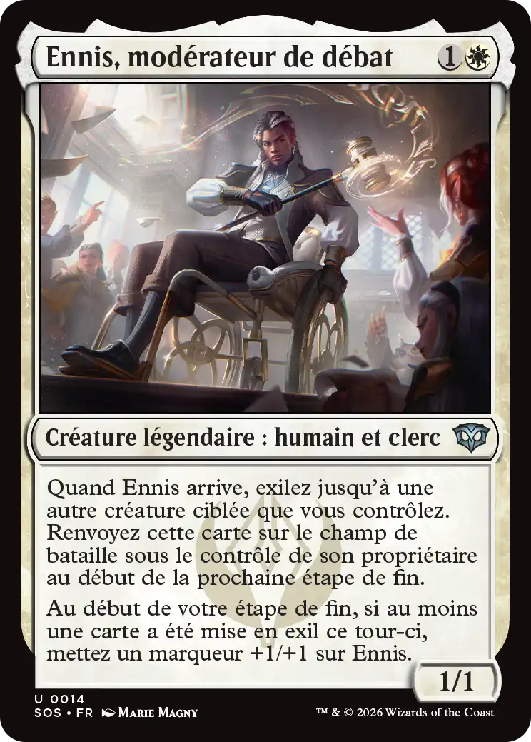 Ennis, modérateur de débat vous permet d'exiler une créature que vous contrôlez avant de la renvoyer en jeu à la fin de votre tour. Vous pouvez ainsi bénéficier à nouveau des éventuels effets d'arrivée en jeu de votre créature, ou bien profiter à nouveau du sort d'une créature qui arrive préparée. Ennis gagne un marqueur +1/+1 à la fin de chacun de vos tours où une carte a été mise en exil.