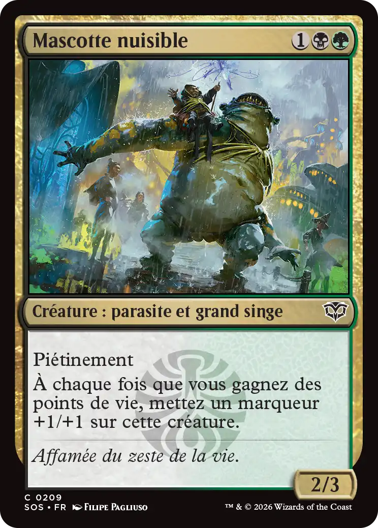 Mascotte nuisible est une 2/3 pour 3 manas avec le piétinement qui reçoit un marqueur +1/+1 à chaque fois que vous gagnez des points de vie. Dans cet archétype, elle peut devenir rapidement très imposante et représenter une vraie menace pour votre adversaire grâce au piétinement.
