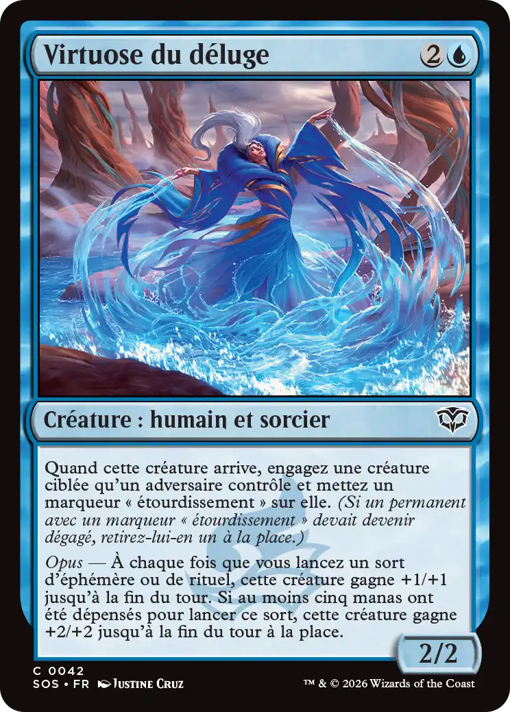 Virtuose du déluge engage une créature à son arrivée en jeu et lui donne un marqueur étourdissement. Grâce à l'Opus, il gagne +1/+1 jusqu'à la fin du tour, et même +2/+2 si votre sort coûtait 5 manas en plus. Vous vous débarrassez temporairement d'une créature adverse gênante.