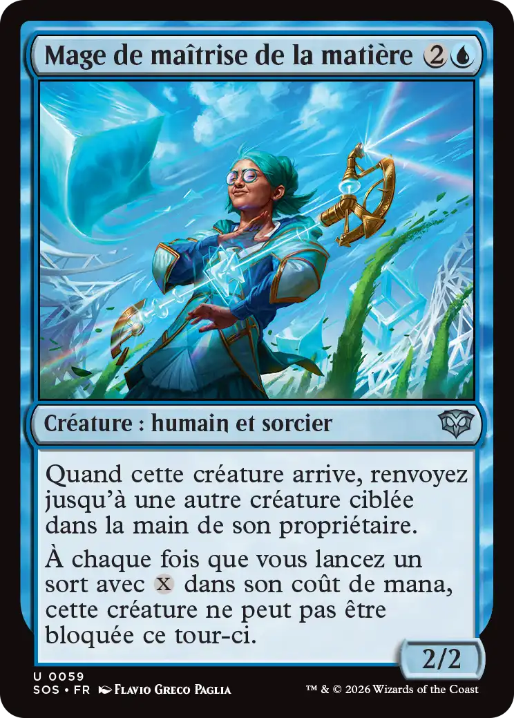Mage de la maîtrise de la matière renvoie une créature dans la main de son propriétaire en arrivant en jeu. Vous temporisez ainsi la sortie de votre adversaire ou renvoyez l'une de vos créatures dans votre main pour bénéficier à nouveau de ses effets. Si vous jouez quelques sorts à X, vous aurez également la possibilité de la rendre imblocable.