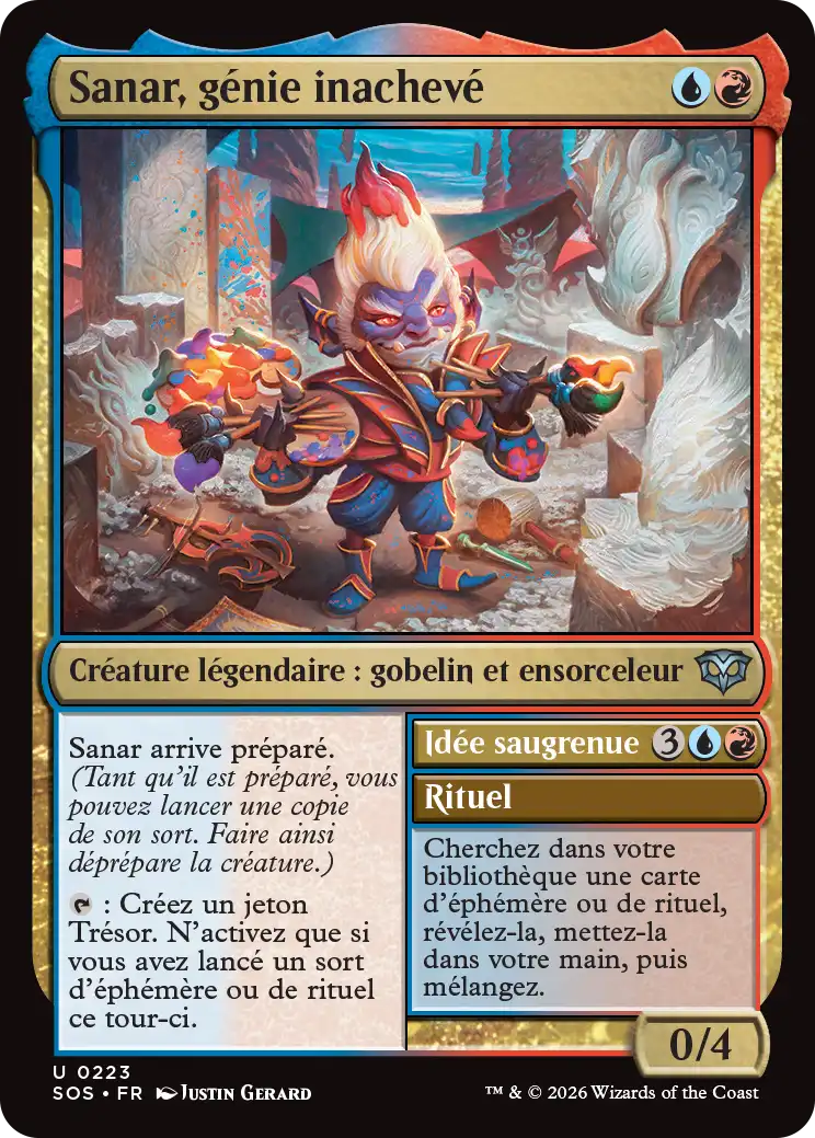 Sanar, génie inachevé est un excellent bloqueur en début de partie en tant que 0/4 pour 2 manas. Il peut s'engager pour créer un jeton Trésor, mais uniquement si vous avez lancé un éphémère ou un rituel ce tour-ci. Il arrive en jeu préparé et vous permet de lancer un sort à 5 manas qui déclenche vos capacités d'Opus et vous fait chercher dans votre bibliothèque pour mettre dans votre main le rituel ou éphémère le plus adapté à votre situation.