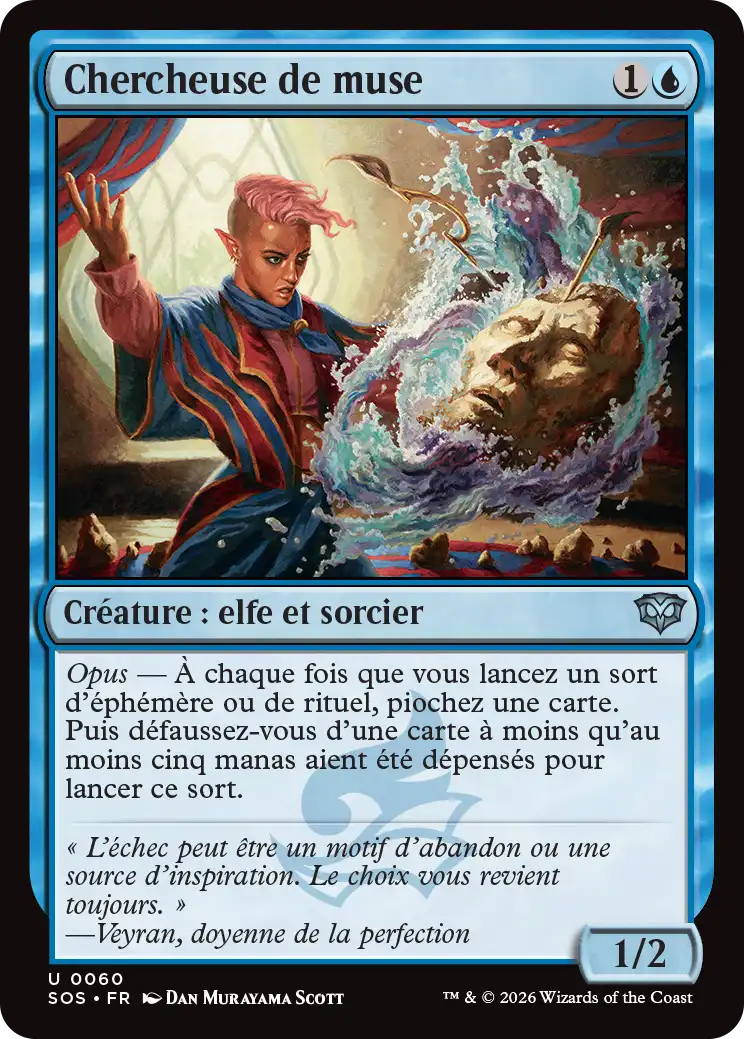 Chercheuse de muse vous fait piocher et défausser une carte grâce à sa capacité d'Opus. Et vous n'aurez pas besoin de défausser si vous déclenchez l'Opus avec un sort coûtant 5 manas ou plus.