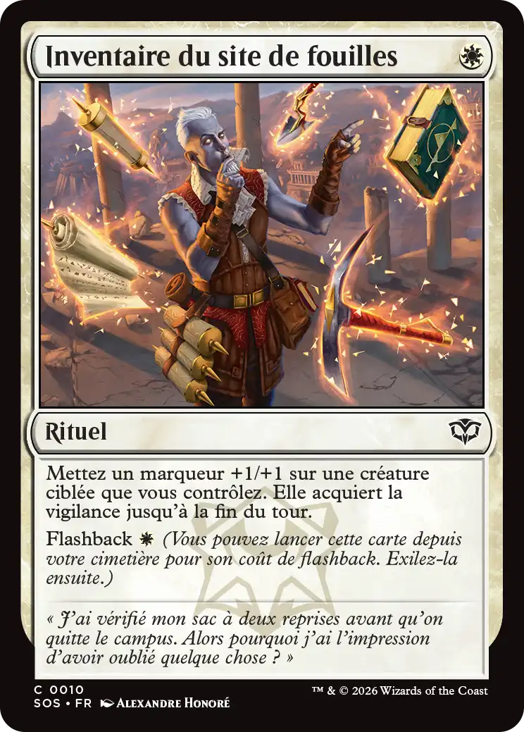 Inventaire du site de fouilles est un rituel pour un simple mana blanc. Il renforce l'une de vos créatures en lui donnant un marqueur +1/+1 ainsi que la vigilance jusqu'à la fin du tour. Grâce au Flashback pour le même coût de mana, Inventaire du site de fouilles représente 2 sorts en une seule carte pour déclencher 2 fois vos capacités de Riposte.