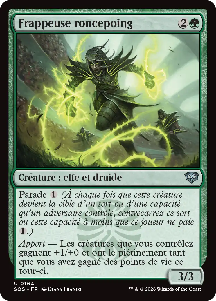 Frappeuse roncepoing est une 3/3 pour 3 manas avec Parade 1. Elle booste vos créatures en leur donnant +1/+0 et le piétinement tant que vous avez gagné au moins un point de vie ce tour-ci. Vous rendez vos grosses créatures difficiles à bloquer avec le piétinement et boostez l'ensemble de vos créatures, ce qui est particulièrement intéressant si vous disposez d'une armée de jetons Parasite.
