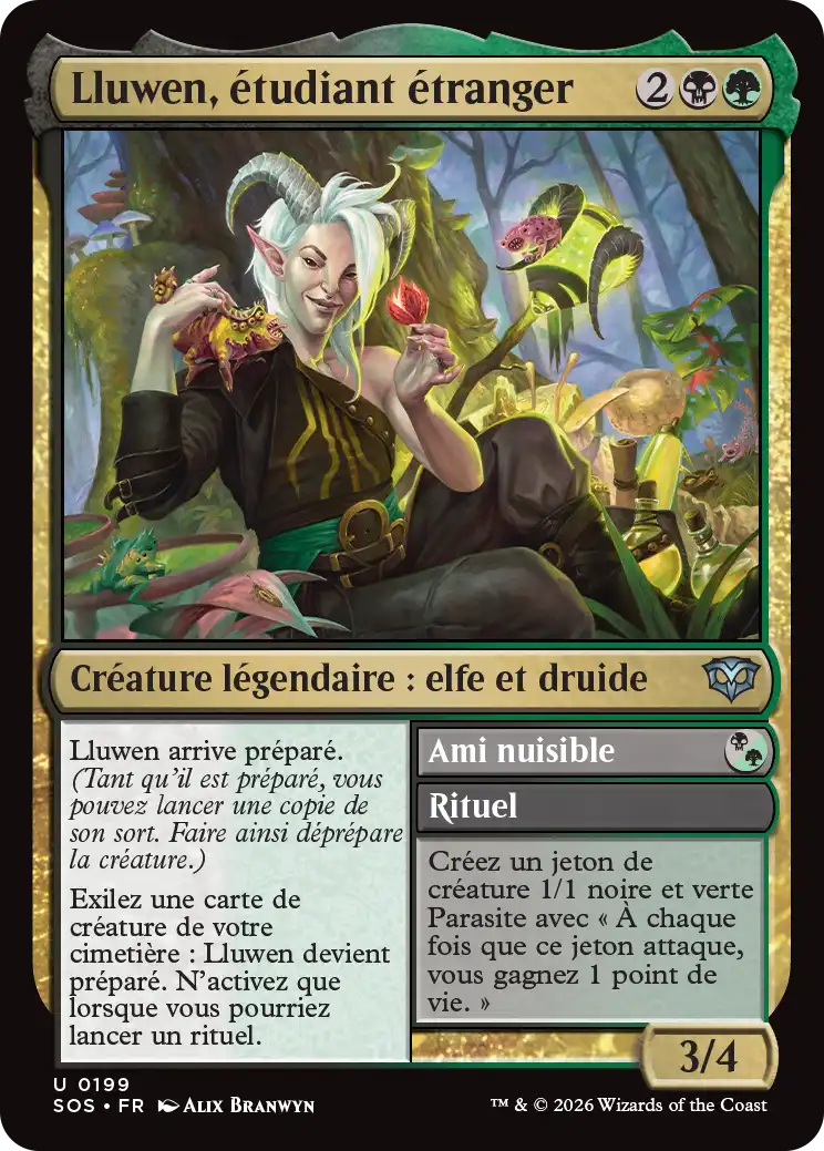 Lluwen, étudiant étranger est une 3/4 pour 4 manas avec un sort de préparation pour un mana hybride noir/vert qui vous donne un jeton parasite 1/1. Lluwen arrive en jeu préparé et peur devenir préparé à nouveau en exilant une carte de votre cimetière. Vous pouvez donc assez facilement créer un jeton parasite par tour et ainsi gagner des points de vie.