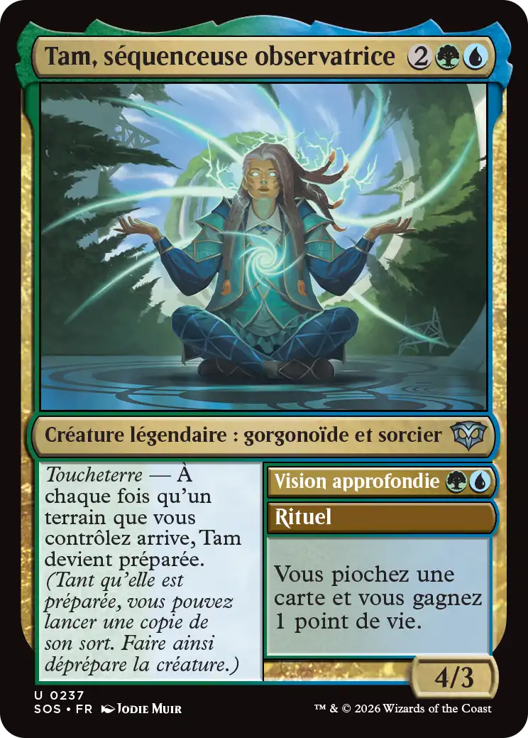 Tam, séquenceuse observatrice est une 4/3 pour 4 manas qui devient préparée à chaque terrain qui arrive en jeu sous votre contrôle grace au toucheterre. Son sort de préparation vous permet de piocher une carte et de gagner 1 point de vie en rituel pour vous assurer d'avoir constamment des sorts à jouer.