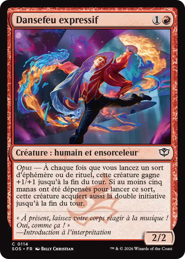 Dansefeu expressif est une 2/2 pour 2 manas avec une capacité d'Opus qui lui donne +1/+1, ainsi que la double initiative si le sort lancé coûtait au moins 5.