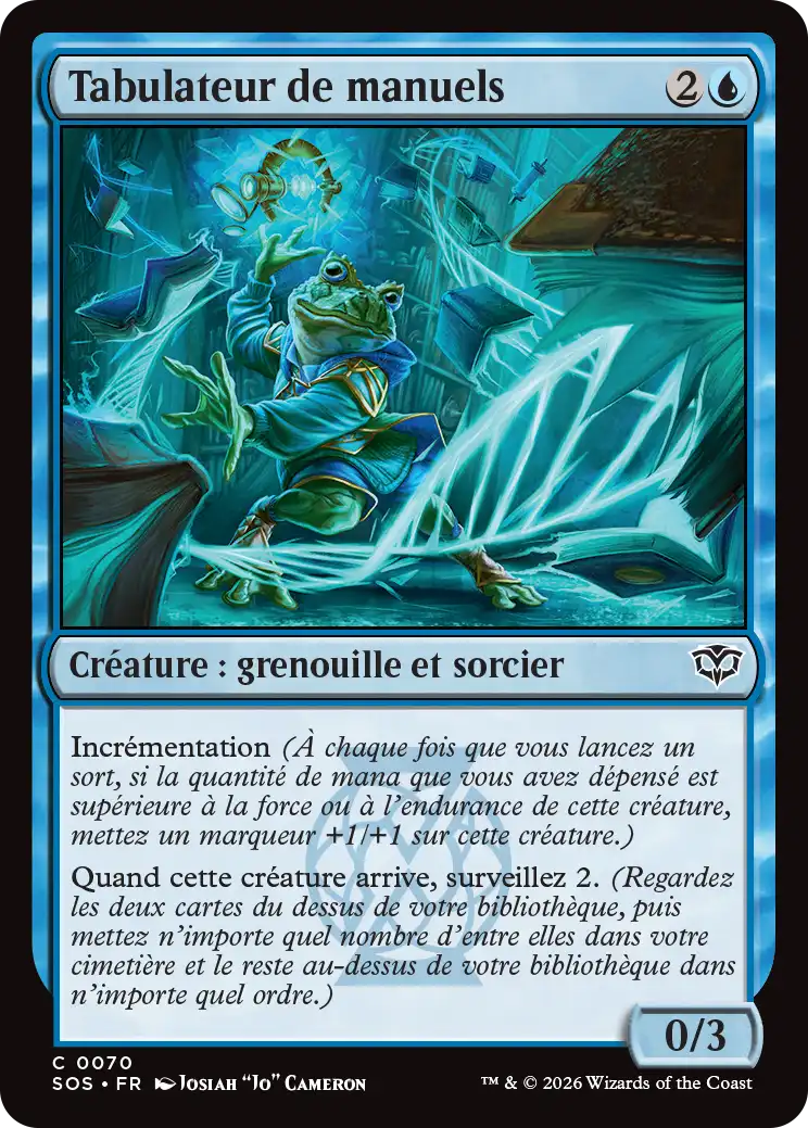 Tabulateur de manuels est une 0/3 pour 3 manas qui vous fait surveiller 2 en arrivant en jeu et vous permet ainsi de filtrer le dessus de votre bibliothèque. Grâce à l'incrémentation, elle grossit de tour en tour.