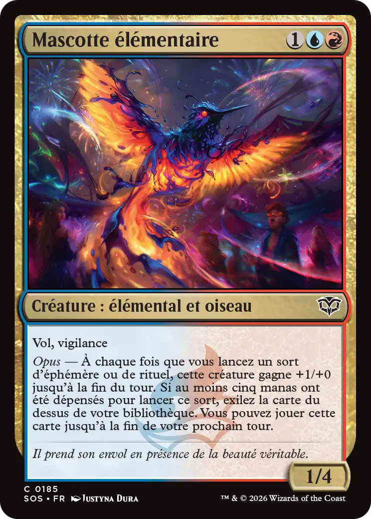 Mascotte élémentaire est une 1/4 pour 3 manas avec le vol et la vigilance. Elle représente un bon bloqueur en début de partie, tout en attaquant à chaque tour avec la vigilance. Sa capacité d'Opus lui donne +1/0 et vous permet d'exiler et de jouer la carte du dessus de votre bibliothèque lorsque vous jouez un sort coûtant 5 ou plus.