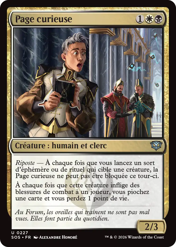 Page curieuse est une 2/3 pour 3 manas. Sa capacité de Riposte la rend imblocable l'espace d'un tour et vous fait bénéficier de sa 2ème capacité qui vous fait piocher en perdant un point de vie lorsqu'elle inflige des blessures de combat. Page curieuse peut donc attaquer sans se soucier des bloqueurs adverses tout en vous fournissant de nouvelles cartes à jouer.