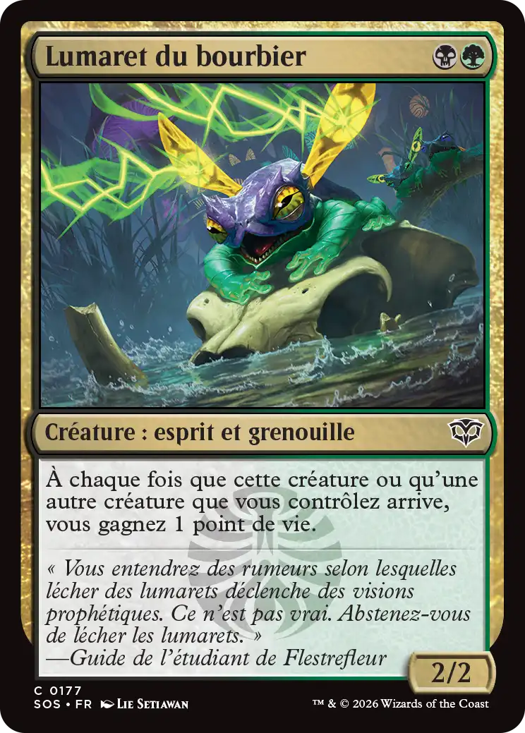 Lumaret du bourbier est une 2/2 pour 2 qui vous fait gagner un point lorsqu'une créature arrive en jeu sous votre contrôle, lui compris. C'est l'un des moyens les plus efficaces de gagner au moins un point de vie à chaque tour pour déclencher vos capacités d'Apport.