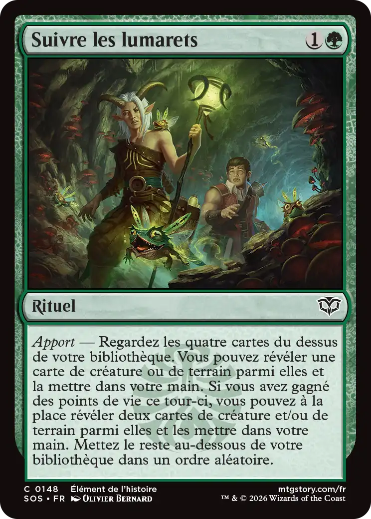 Suivre les lumarets est un rituel pour 2 manas qui vous fait révéler les 4 cartes du dessus de votre bibliothèque pour choisir une créature ou un terrain à mettre dans votre main. Si vous avez gagné au moins un point de vie ce tour-ci, vous pouvez choisir 2 de ces cartes à la place.