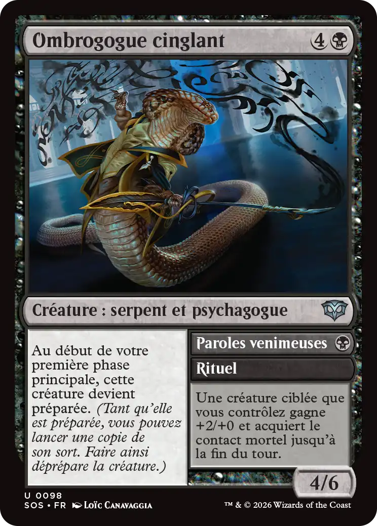 Ombrogogue cinglant est une 4/6 pour 5 manas qui devient automatiquement préparée au début de votre première phase principale. Vous pouvez donc lancer son sort une fois par tour pour donner +2/+0 et contact mortel à l'une de vos créatures tout en déclenchant vos effets de Riposte.