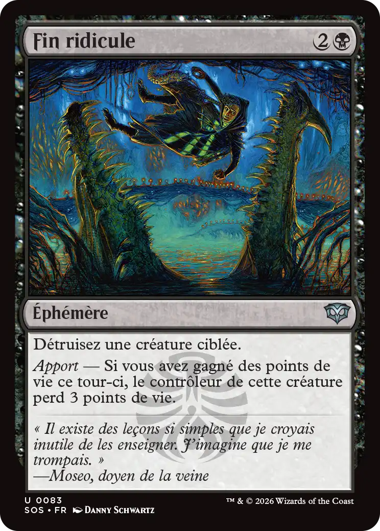 Fin ridicule détruit une créature ciblée en éphémère pour 3 manas. Grâce à l'apport, le contrôleur de cette créature perd également 3 points de vie si vous en avez gagné durant ce tour.