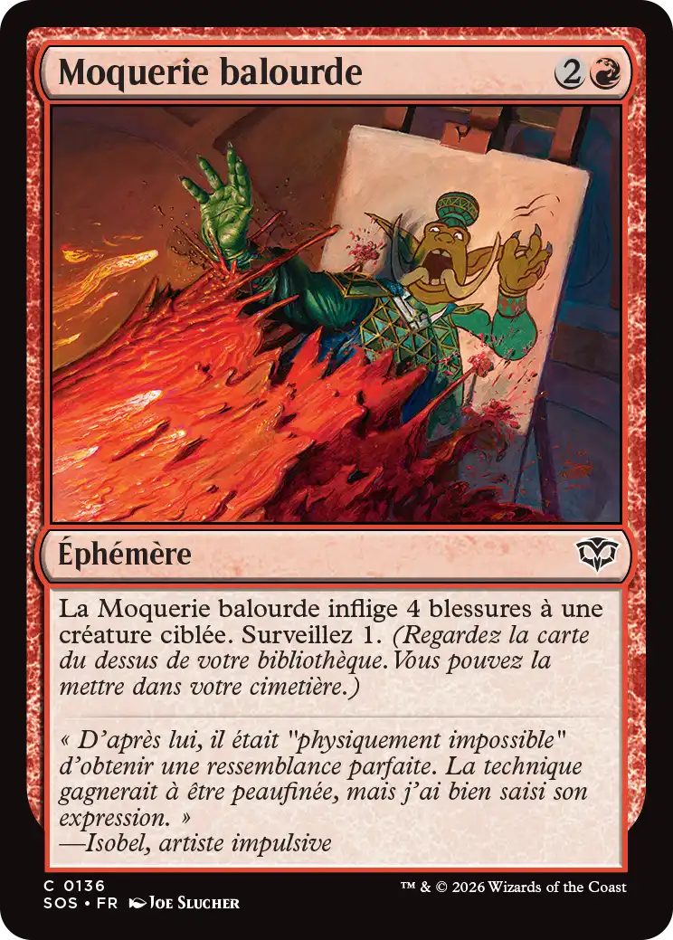 Moquerie balourde est un bon removal pour 3 manas en éphémère qui inflige 4 blessures à une créature ciblée en plus de vous faire surveiller 1.