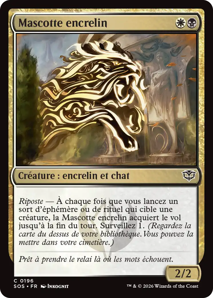Mascotte encrelin est une 2/2 jouable dès votre tour 2. Grâce à la Riposte, elle acquiert le vol et contourne les défenses adverses en plus de vous faire surveiller 1 pour filtrer le dessus de votre bibliothèque et accéder plus rapidement aux cartes dont vous avez besoin.