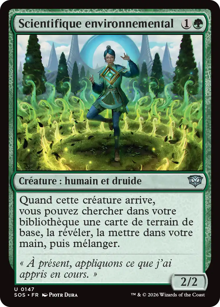 Scientifique environnemental est une 2/2 pour 2 manas qui vous permet de chercher un terrain de base dans votre bibliothèque et de le mettre dans votre main. Il vous aide à ne pas manquer de terrains à jouer et vous permet d'accéder à une couleur supplémentaire.