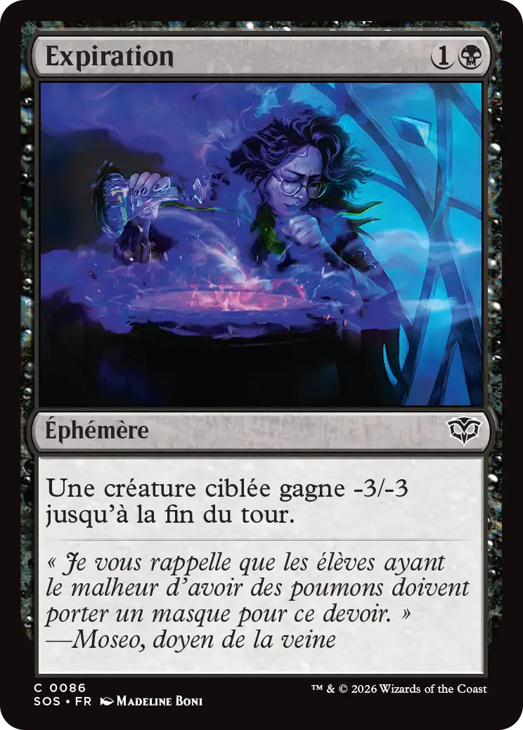 Expiration donne -3/-3 à une créature ciblée pour 2 manas. C'est un removal classique déjà réédité à plusieurs reprises.