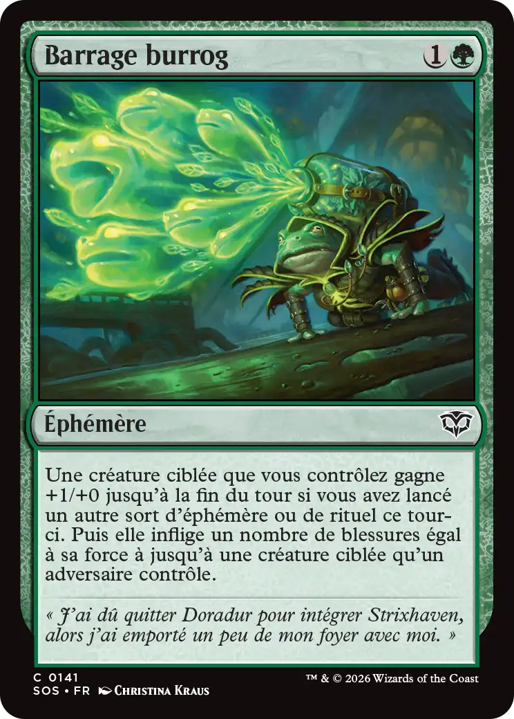 Barrage burrog donne +1/+0 à l'une de vos créatures si vous avez lancé un autre éphémère ou rituel ce tour. Il inflige ensuite un nombre de blessures égal à sa force à une créature adverse. C'est un bon removal en éphémère qui nécessite toutefois d'avoir une créature en jeu.
