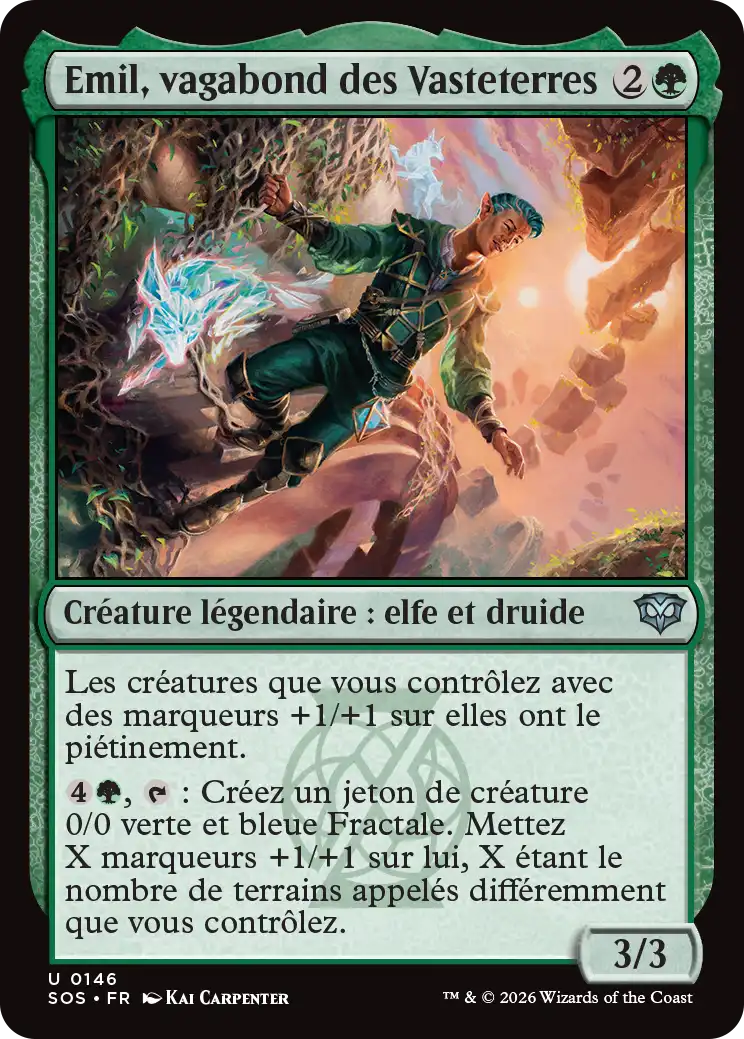 Emil, vagabond des Vasteterres donne le piétinement à toutes vos créatures qui ont des marqueurs sur elle, ce qui est particulièrement utile sur vos créatures avec incrémentation qui deviennent rapidement imposantes. Pour 5 manas, il peut également s'engager pour créer un jeton 0/0 avec autant de marqueurs +1/+1 sur lui que de terrains sous votre contrôle avec des noms différents.