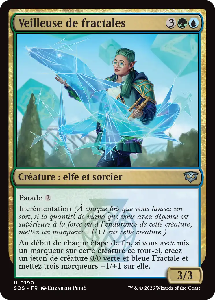 Veilleuse de fractales est une 3/3 pour 5 manas avec Parade 2 et incrémentation. À la fin de votre tour, si vous avez mis un marqueur +1/+1 sur elle, vous créez un jeton 0/0 sur lequel vous placez trois marqueurs +1/+1. De quoi obtenir rapidement une présence très importante sur le champ de bataille.