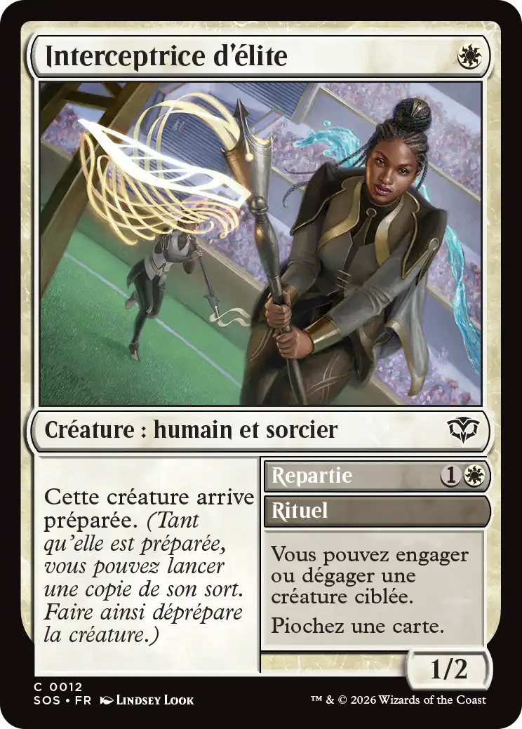 Interceptrice d'élite est 1/2 pour un simple mana blanc. Elle arrive préparée et vous permet de lancer un Rituel pour 2 manas qui engage ou dégage une créature en plus de vous faire piocher une carte. C'est à la fois une créature et un sort, avec la possibilité de retirer un bloqueur adverse ou de dégager l'une de vos créatures, tout en piochant.