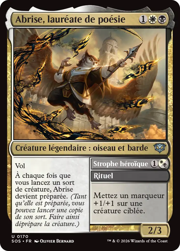Abrise, lauréate de poésie est une 2/3 avec le vol pour 3 manas. Elle devient préparée à chaque fois que vous jouez une créature, vous permettant ainsi de lancer son sort pour mettre un marqueur +1/+1 sur une créature ciblée. Vous pouvez cibler Abrise pour en faire une véritable menace avec sa capacité d'évasion. Abrise renforce l'équilibre entre sorts et créatures au sein de votre deck en vous fournissant régulièrement un sort à lancer pour déclencher vos capacités de Riposte.