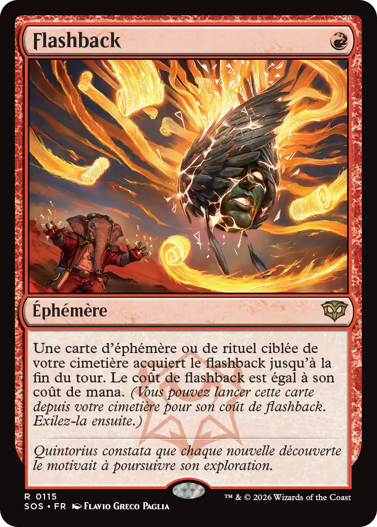 Pour un simple mana rouge, Flashback est un éphémère qui donne la capacité du même nom à l'un de vos éphémères ou rituels au cimetière jusqu'à la fin du tour. Vous pourrez alors rejouer cette carte en payant un coût de Flashback égal à son coût de mana.