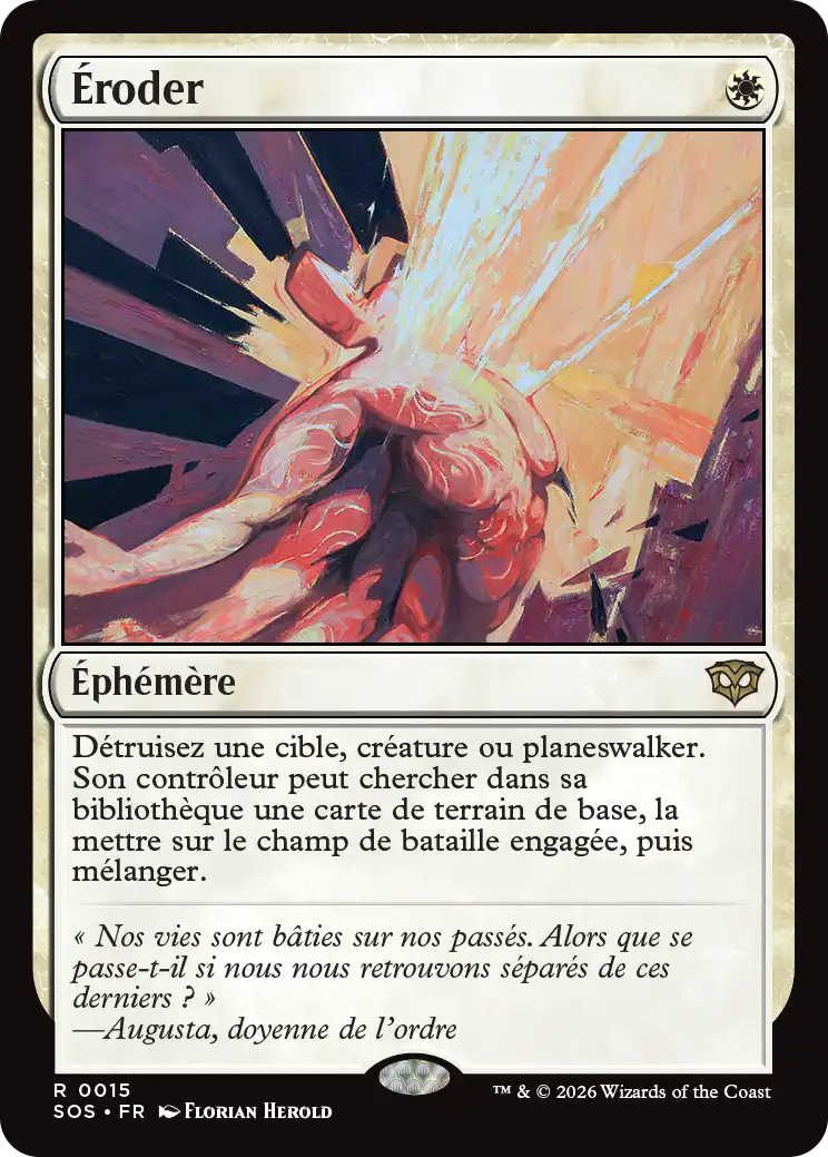 Éroder est un éphémère pour un simple mana blanc qui permet de détruire une créature ou un Planeswalker. Le contrôleur du permanent détruit peut aller chercher un terrain de base dans sa bibliothèque et le mettre en jeu engagé.