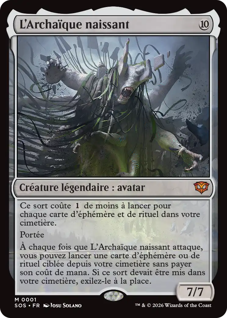 Archaïque naissant est une 7/7 avec la portée pour 10 manas incolores dont le coût est réduit d'un mana pour chaque carte d'éphémère ou de rituel présente dans votre cimetière. Lorsqu'il attaque, vous pouvez lancer gratuitement un éphémère ou un rituel de votre cimetière avant de l'exiler.