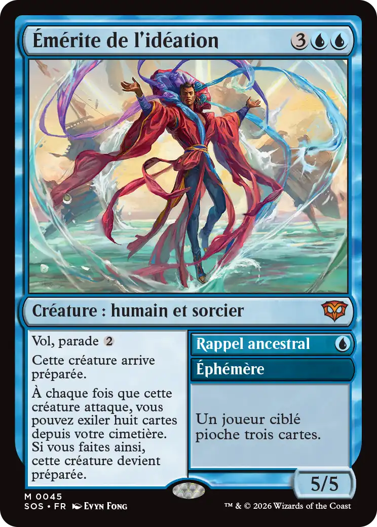 Émérite de l'idéation est une 5/5 vol et parade 2 pour 5 manas. Elle arrive en jeu préparée et vous permet de lancer le sort le plus puissant de l'histoire de Magic : Ancetral Recall. À cette occasion, la carte reçoit d'ailleurs sa toute première traduction en français sur une carte physique : Rappel ancestral.