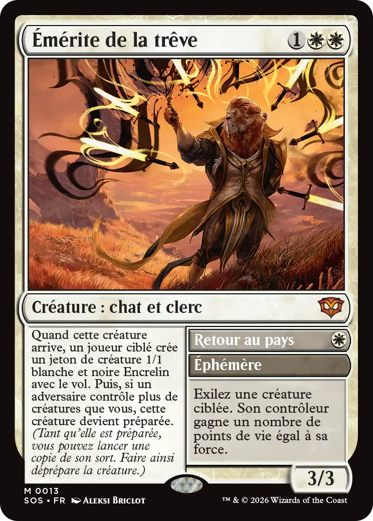 Émérite de la trêve est une 3/3 pour 3 manas. Lors de son arrivée en jeu, vous créez un jeton de créature 1/1 vol sous le contrôle d'un joueur ciblé. Puis, si l'un de vos adversaires contrôle plus de créatures que vous, l'Émérite devient préparé. Il vous permet alors de lancer l'un des anti-créatures les plus connus de Magic et présent depuis la toute première édition du jeu : Retour au pays.