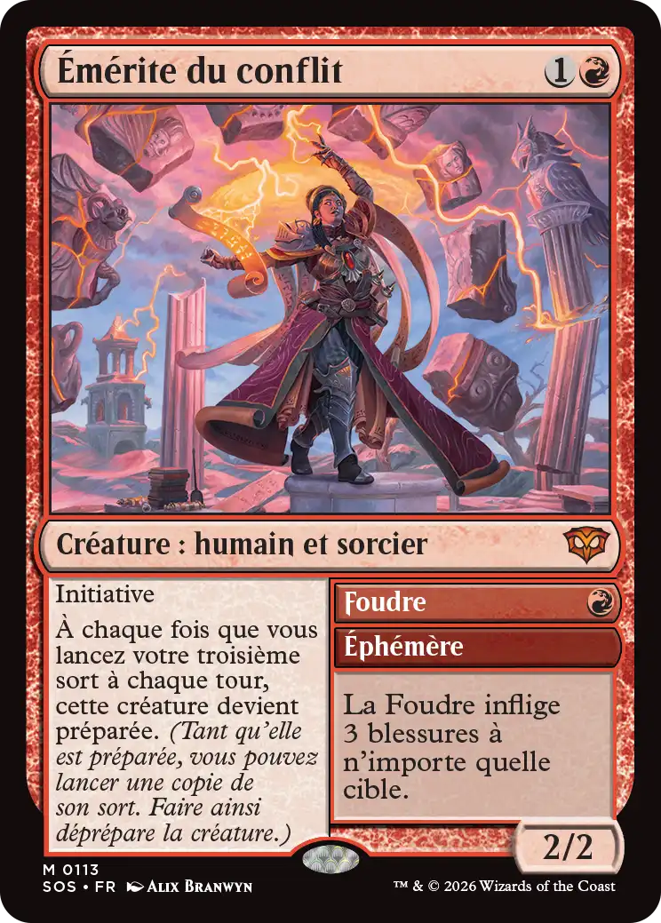 Lorsque vous lancez votre 3ème sort lors d'un tour, l'Émérité du conflit devient préparé. Vous pouvez alors lancer ce qui est probablement le sort le plus iconique de toute l'histoire de Magic : Foudre.
